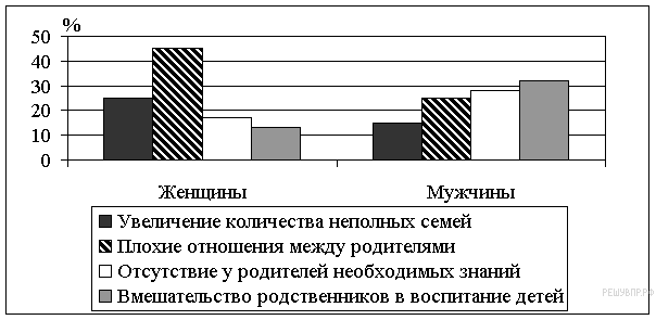 Учёные опросили группу 45-летних жителей страны Z. Женщинам и мужчинам задавали вопрос: «Почему снижается воспитательный потенциал семьи?». Результаты опроса представлены в гистограмме